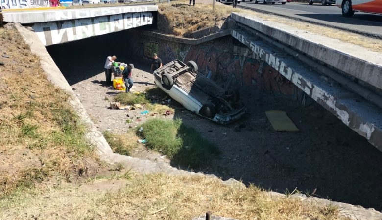 Vuelca vehículo y cae en un dren pluvial