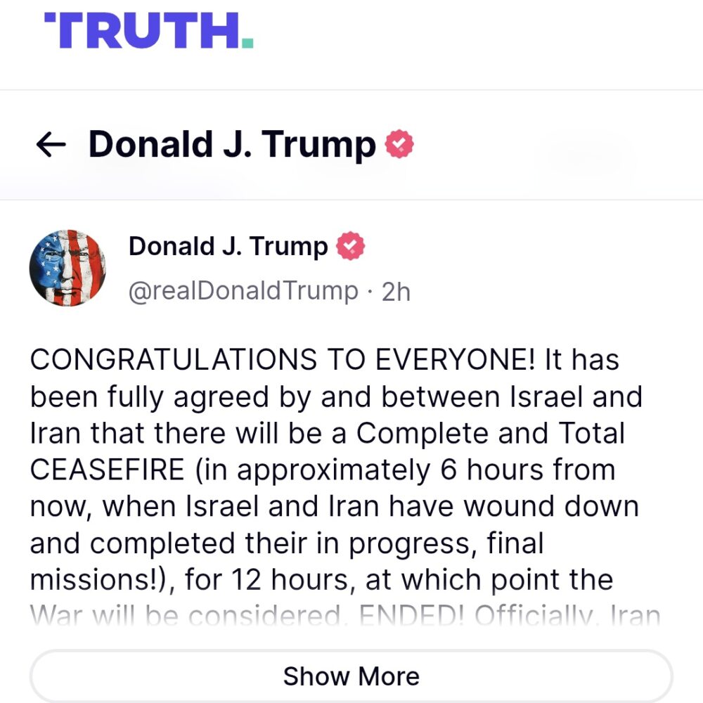 🤝 Trump agradeció a Irán e Israel el acuerdan detener hostilidades, dice Trump. Un alto de a la “Guerra de 12 Días, y aseguró que esto demuestra la posibilidad de evitar una escalada mayor del conflicto, haciendo un llamado a Israel 🇮🇱 a actuar con mesura y buscar la paz ✌️🕊️.