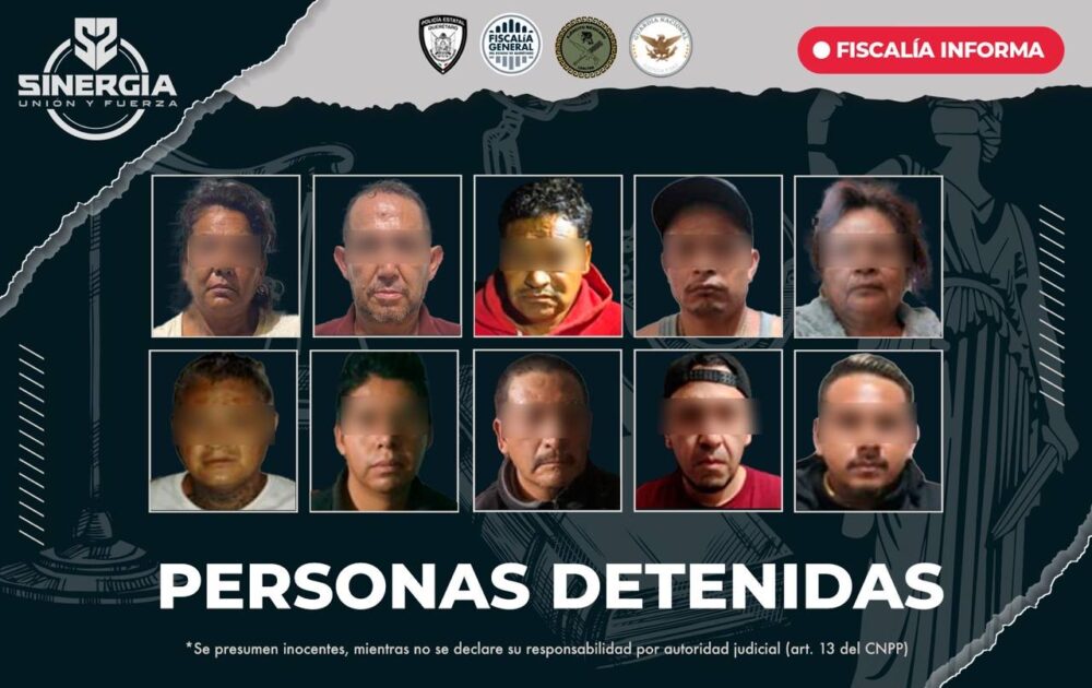 La Fiscalía General del Estado informó que un operativo conjunto con fuerzas de seguridad derivó en la detención de 10 personas, durante cateos efectuados en distintos puntos de la zona metropolitana.