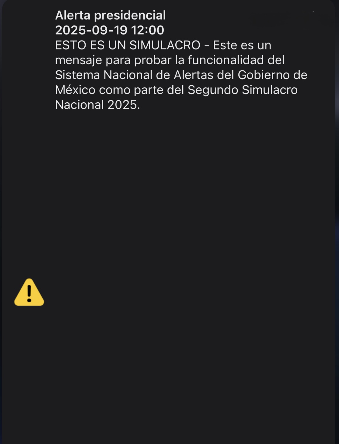 El aviso fue emitido bajo la categoría de “Alerta presidencial” y aclaró que se trataba de un simulacro. El texto enviado a los dispositivos señalaba: “ESTO ES UN SIMULACRO – Este es un mensaje para probar la funcionalidad del Sistema Nacional de Alertas del Gobierno de México como parte del Segundo Simulacro Nacional 2025”.