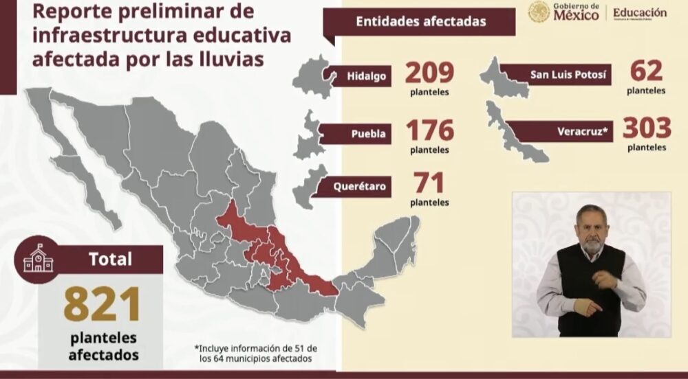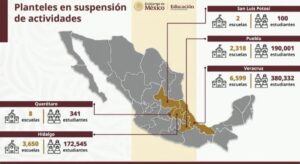El reporte de la Secretaría de Educación Pública indicó que en todo el país suman más de 12 mil planteles en suspensión de actividades, concentrados principalmente en Veracruz, Puebla, Hidalgo, San Luis Potosí y Querétaro.