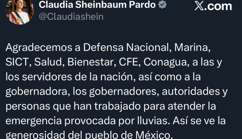 Sheinbaum reconoce apoyo de gobernadores ante afectaciones por lluvias