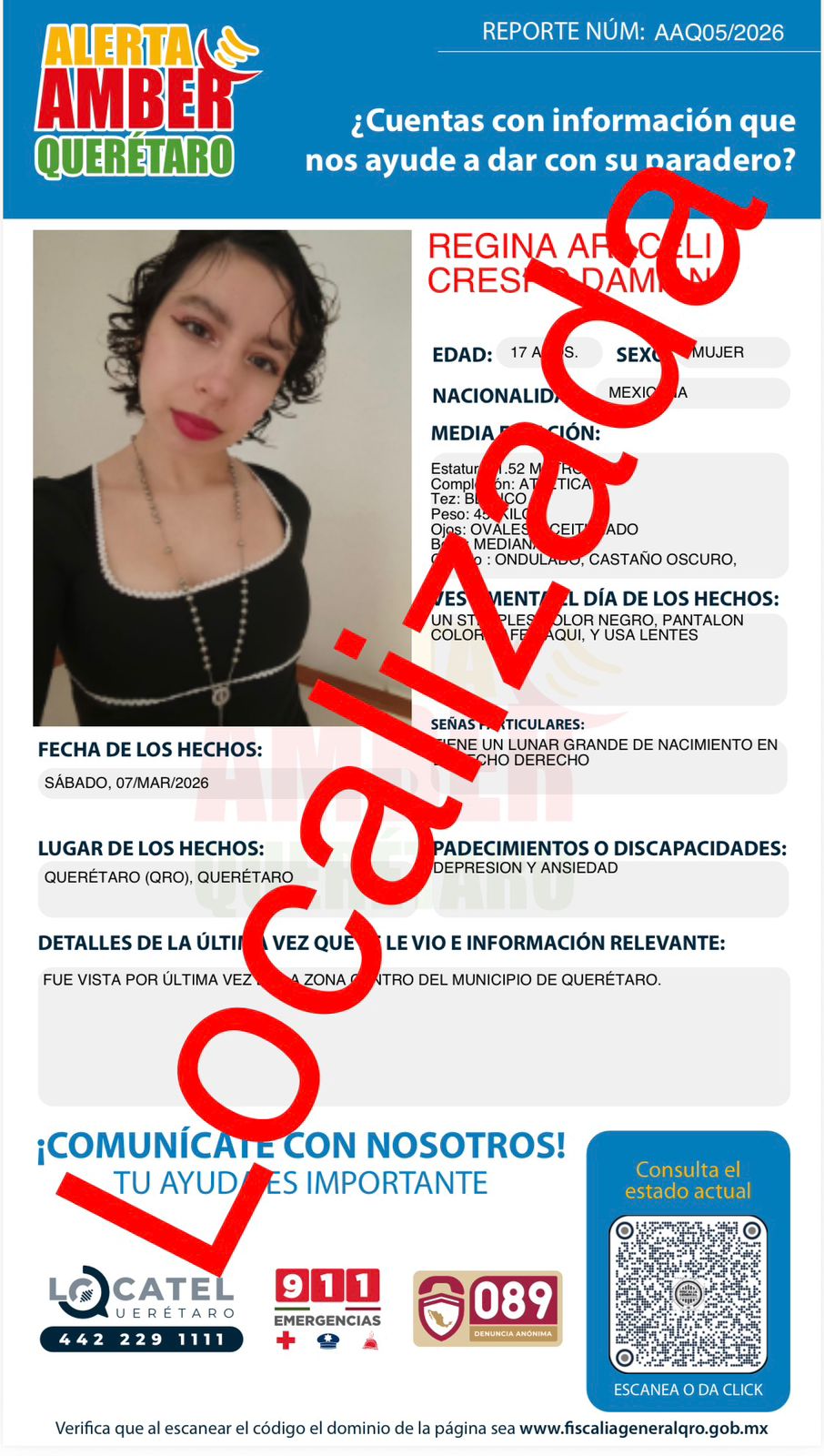 ✅ ¡Localizada! Regina Araceli