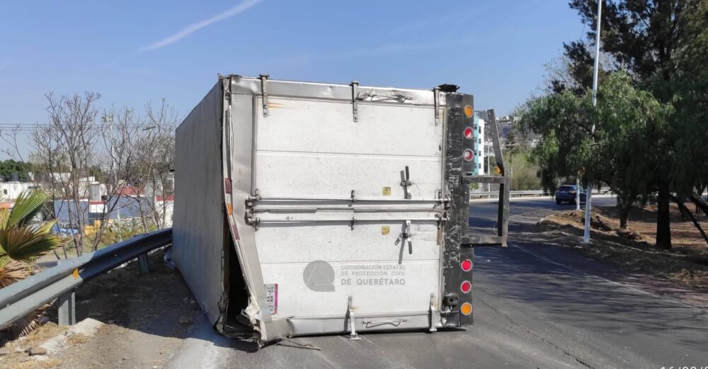 Un camión de carga se volcó en la curva que conecta la carretera 57 con Bernardo Quintana, en el acceso a la ciudad de Querétaro.